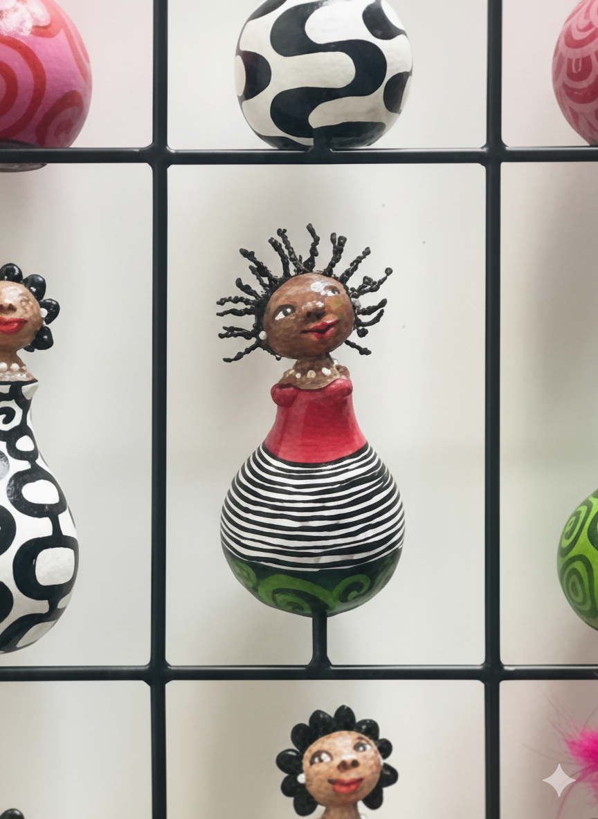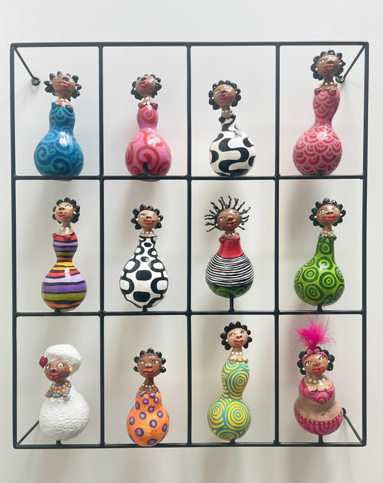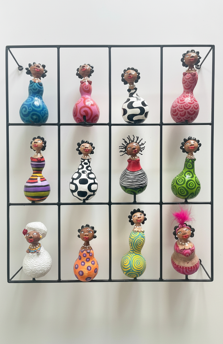 Une grille noire contenant 12 figurines colorées représentant des femmes, avec des coiffures et vêtements variés, suspendues contre un mur blanc.